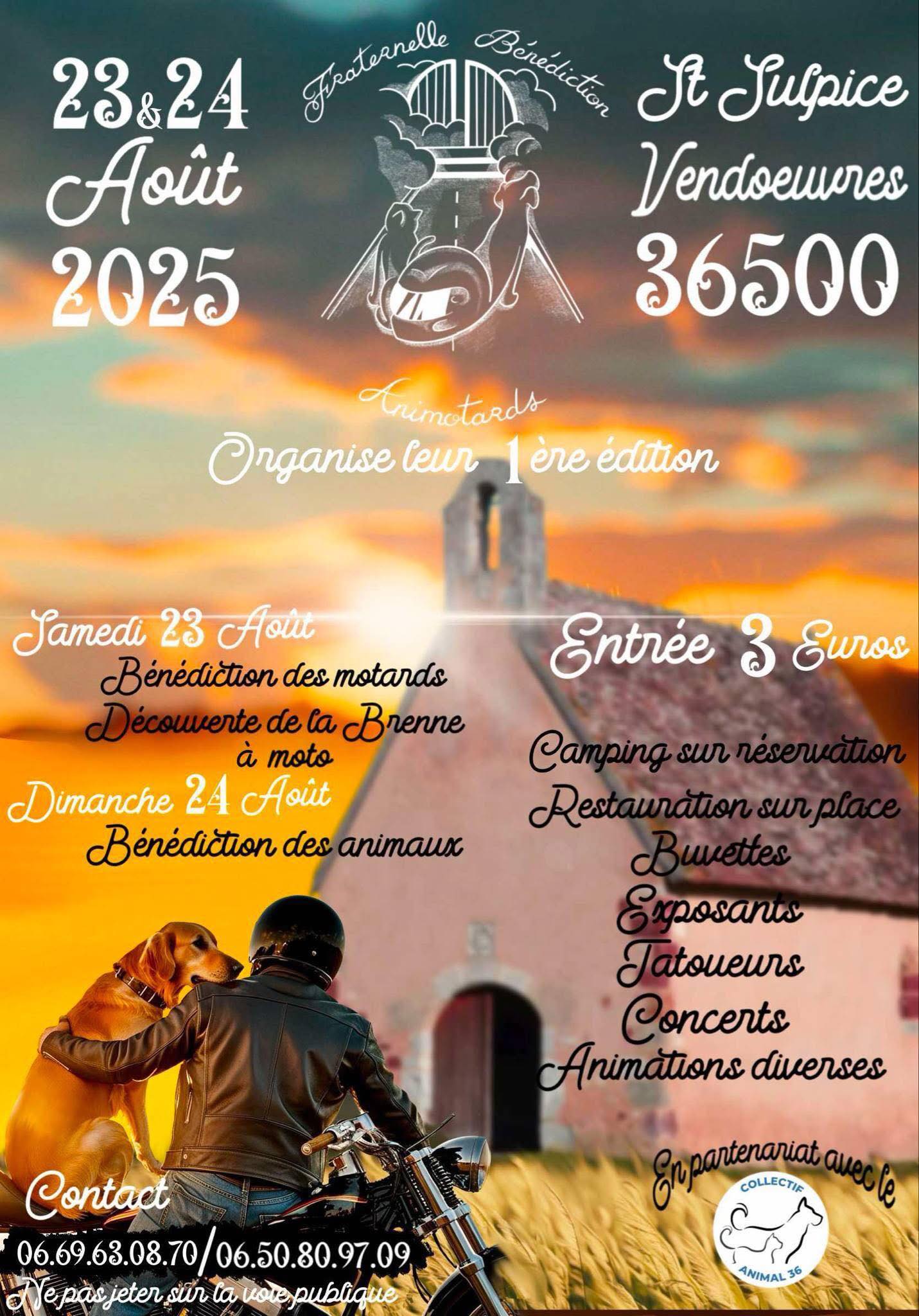 Au coeur de la forêt de Lancosme se tiendra un évènement unique mêlant spiritualité et partage: une grande rencontre autour de la bénédiction des motards et des animaux. dans une ambiance chaleureuse et authentique cete évènement rassemble amoureux de la route, familles et amis des animaux. Le samedi bénédiction des motards et le dimanche bénédiction des animaux. Camping sur réservation, restaurations sur place, exposants, tatoueurs, concerts, animations diverses.