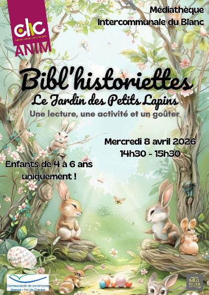 La bibliothèque invite les petits explorateurs de 4 à 10 ans à : 1- une lecture pour rêver et découvrir, 2- une activité pour s’amuser et créer, 3- un goûter pour reprendre des forces après l’aventure ! Une jolie lecture d'histoires sur le thème de Pâques pour rêver et voyager avec les lapins, les oeufs et le printemps. Un jeu pour s'amuser, et partager un moment rigolo. Un délicieux goûter pour terminer cette belle aventure en douceur. Une animation douce et conviviale pour les enfants de 4 à 6 ans. Venez célébrer Pâques dans un univers rempli de livres, de surprises et de bonne humeur !