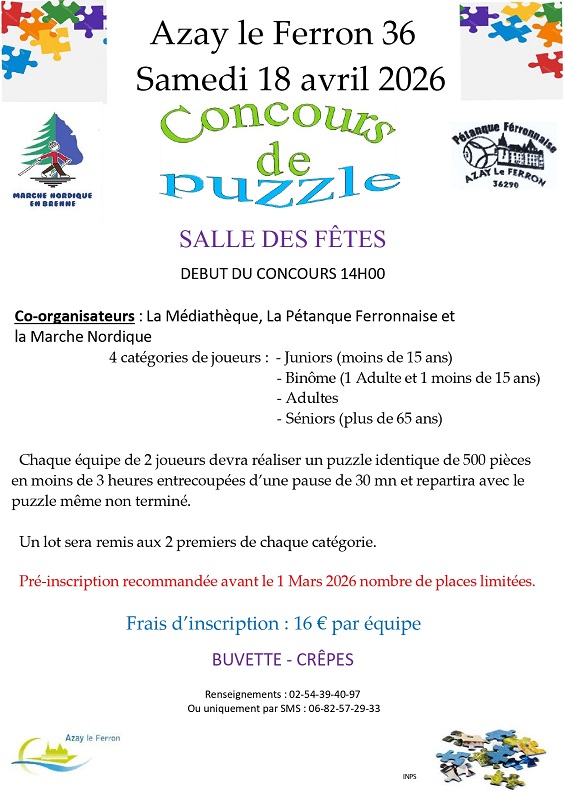 Chaque équipe de 2 joueurs devra réaliser un puzzle identique de 500 pièces en moins d e3h entrecoupées d'une pause de 30 min et repartira avec le puzzle même non terminé.. Buvette et crêpes sur place.