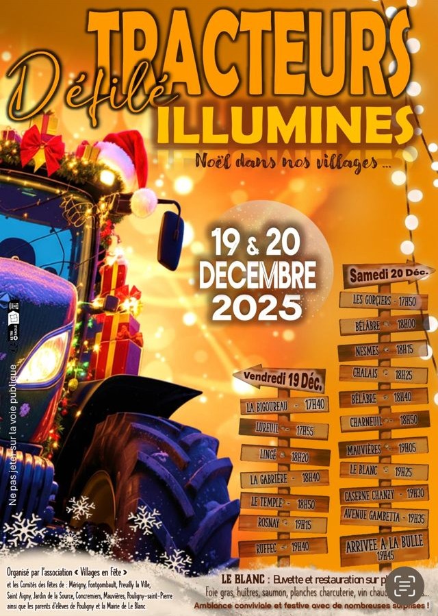 Les agriculteurs vous invitent à partager un moment convivial et magique autour d’un défilé unique de tracteurs, soigneusement décorés et qui brilleront de mille feux. Ambiance conviviale et festive avec de nombreuses surprises !