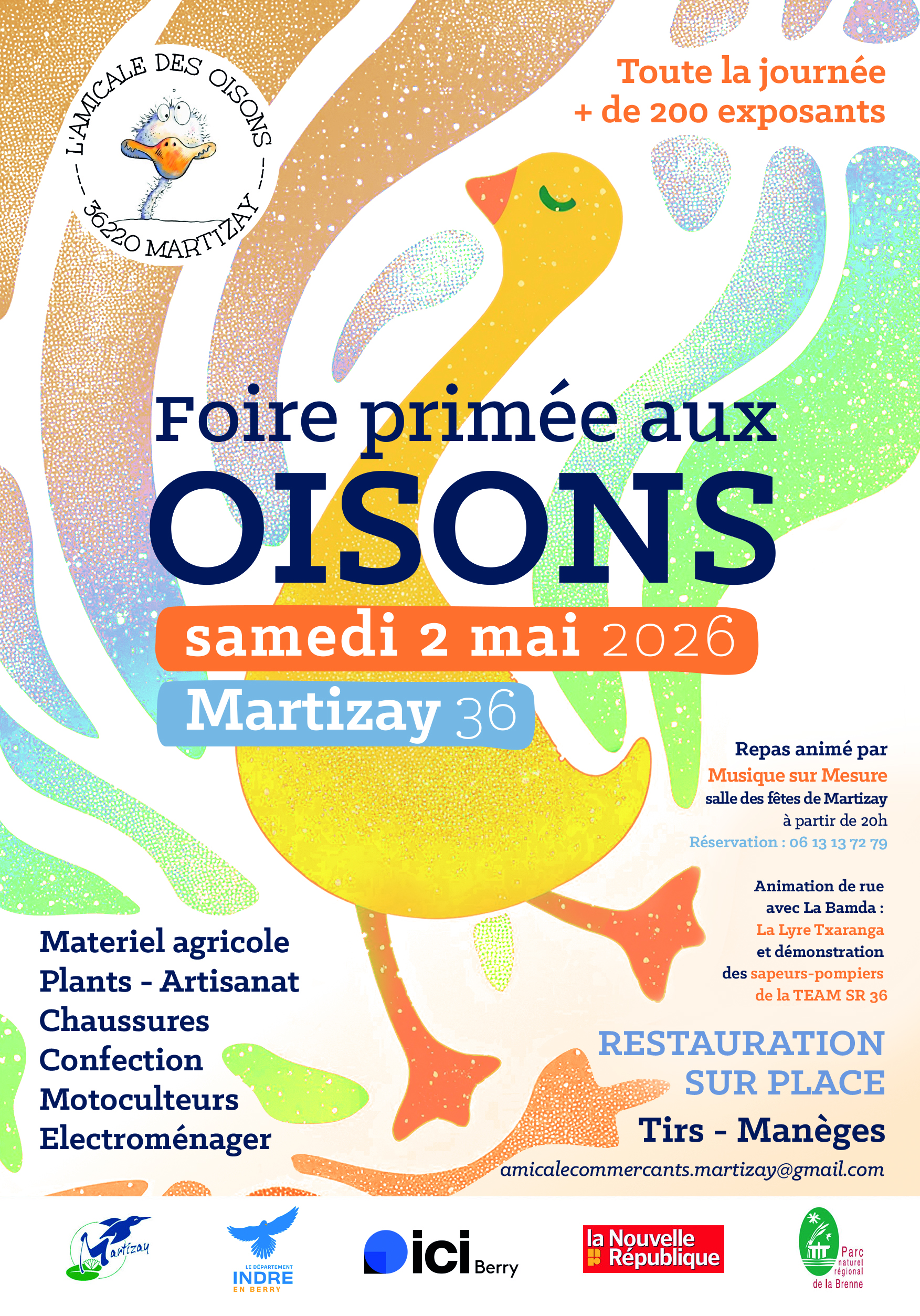 Plus de deux cents stands sont annoncés sur le champ de foire et dans les rues de la cité : vente de volaille, concours oisons, foire à tout, plants, artisanat, matériel agricole, chaussures, confection, életroménager.... Animation gratuite : maquillage pour les enfants avec photos souvenirs. Possibilité de restauration sur place, attractions enfants.