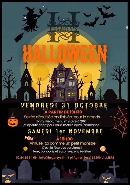 ça commence le vendredi avec une soirée déguisée endiablée pour les grands. Party disco avec menu mystère et apéritif offert pour vous mettre dans l'ambiance. Samedi après-midi: amuse-toi comme un petit monstre! c'est la fêtes des sorcières !, Jeux, bonbons et surprises.