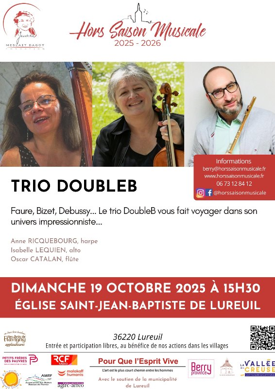 Concert à l'Eglise deLureuil avec le trio Doubleb, au programme, Faure, Bizet, debussy ... Trio Doubleb vous fait voyager dans son univers impressionniste.