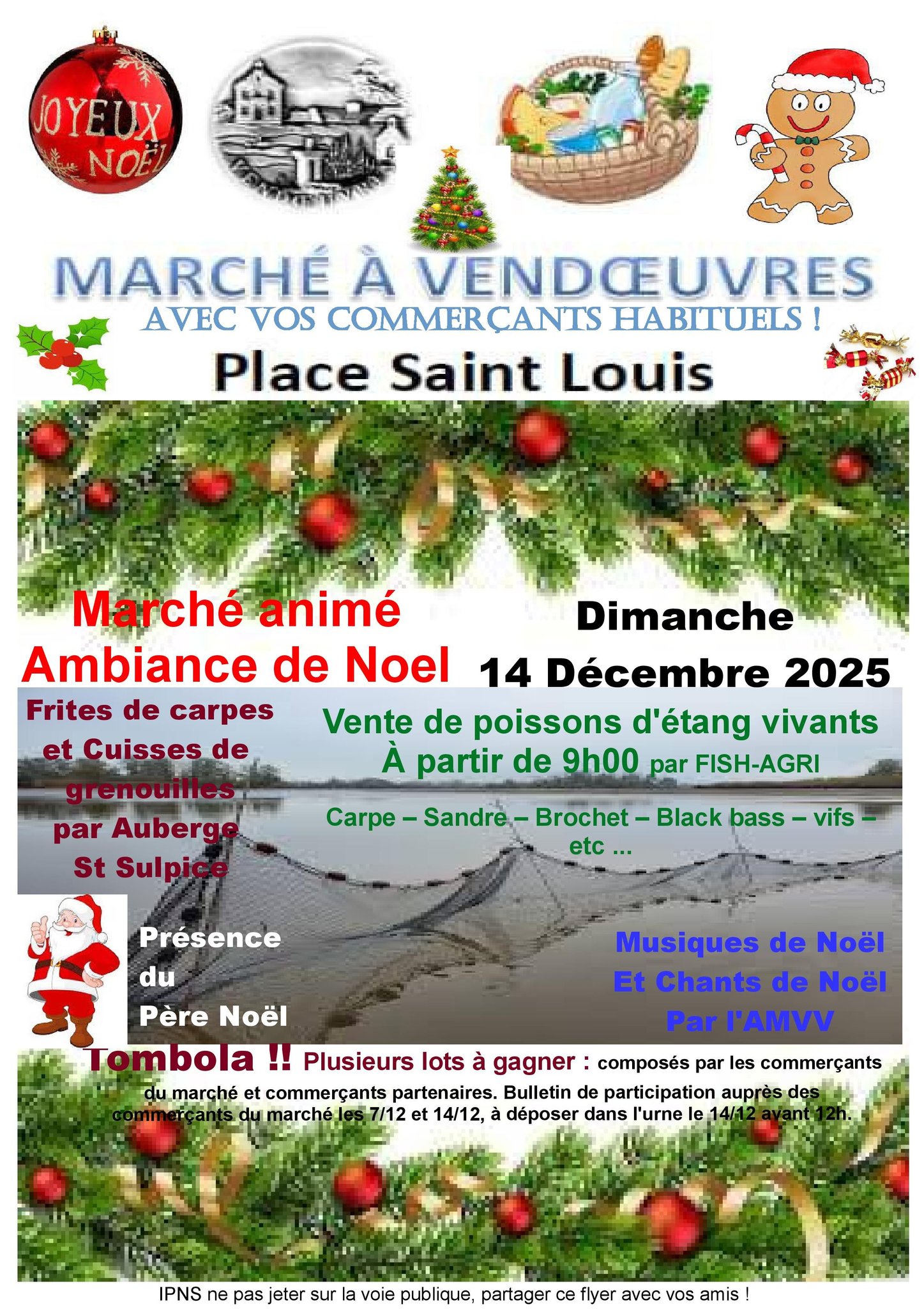 Vente de poissons d'étang vivants par Fish Agri (dès 9h). Exposition de peintures sur les étangs de la Brenne. Tombola Musiques et chants de Noël par l'A.M.V.V. Présence du père Noël. Frites de carpes et cuisses de grenouilles par l'auberge St Sulpice.