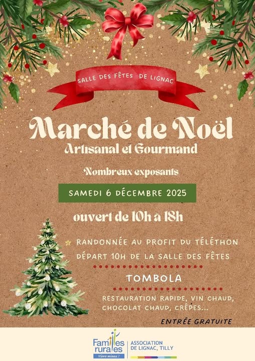 Marché de Noël artisanal et gourmand. Restauration rapide le midi, vin chaud, chocolat chaud, crêpes et randonnée pédestre à 10h au profit du Téléthon.
