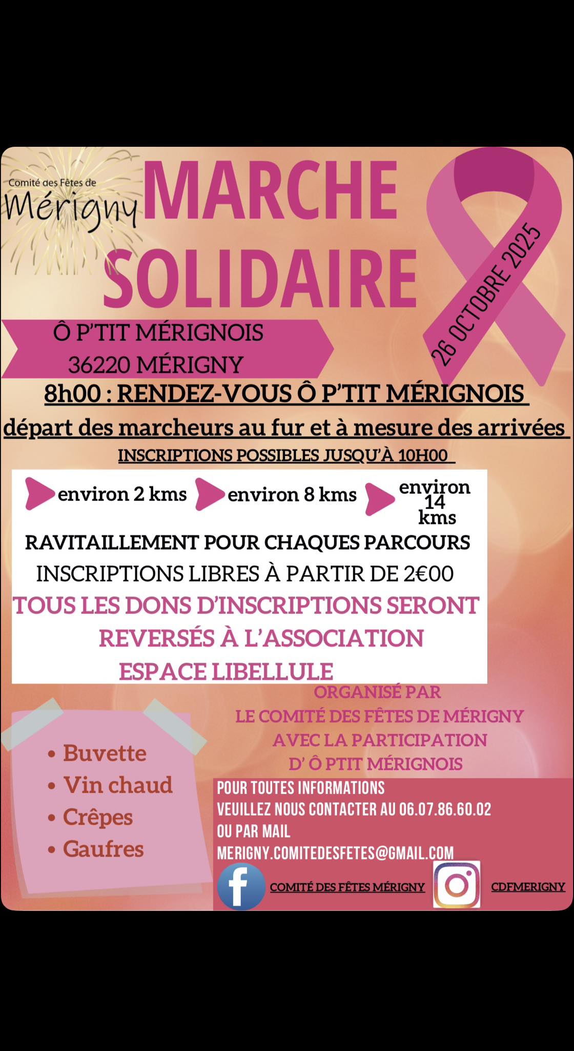 Le comité des fêtes organise pour la troisième année consécutive une marche solidaire en faveur d’octobre rose. Tous les dons d'inscription seront reversés à l'association espace Libellule. 3 parcours de 2, 8 et 14 km avec ravitaillement sur chaque parcours. Buvette, vin chaud, crêpes et gaufres.