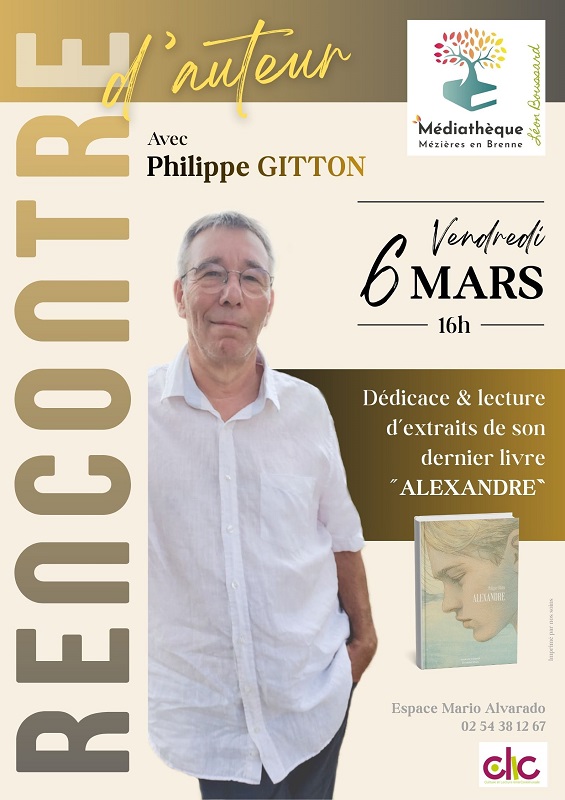Philippe Gitton sera à la médiathèque pour une dédicace et lecture d'extraits de son dernier livre "Alexandre".