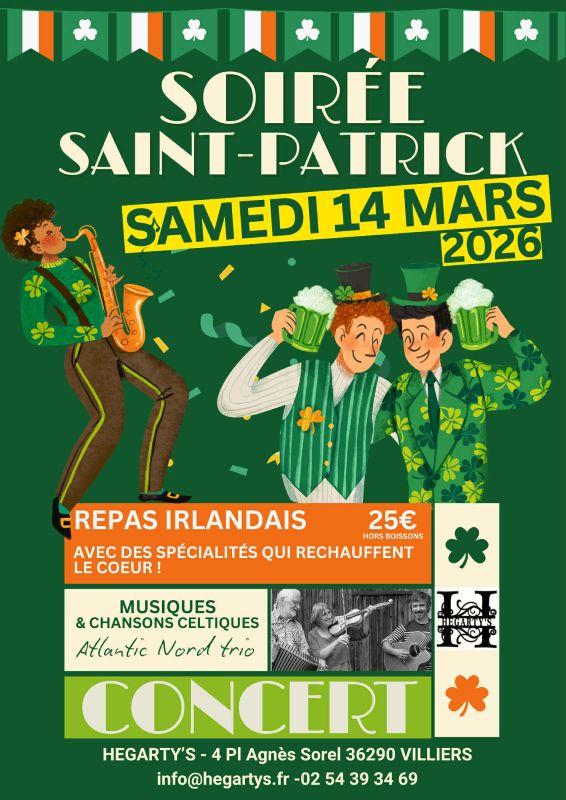 Musiques et chansons celtiques avec Atlantic Nord Trio, repas irlandais avec des spécialités qui rechauffent le coeur!