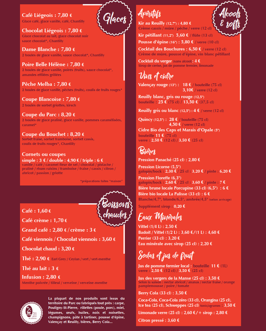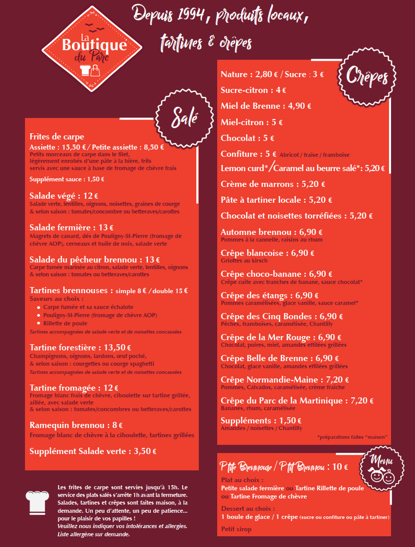 Situé au sein de la Maison du Parc, l’espace restauration propose une cuisine simple et conviviale, mettant à l’honneur les produits locaux et du terroir, à déguster sur place ou à emporter. Cuisine mettant à l'honneur les produits locaux et du terroir : tartines à la carpe fumée, au Pouligny-Saint-Pierre et aux rillettes, propositions du moment, frites de carpe, salades et tartines au goût du terroir, crêpes et desserts à la carte, menu enfant. Plats salés servis jusqu’à 15h. Menu groupe sur demande.