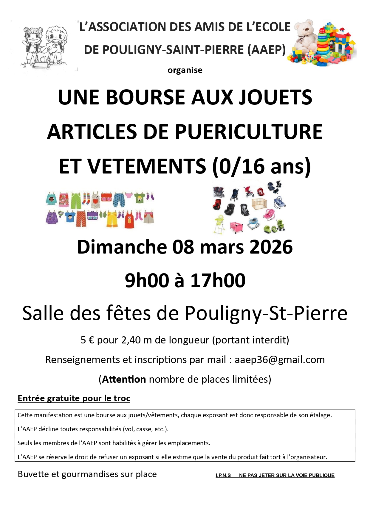 L'association des amis de l'école de Pouligny propose une bourse jouets et vêtements. Buvette et gourmandises sur place.