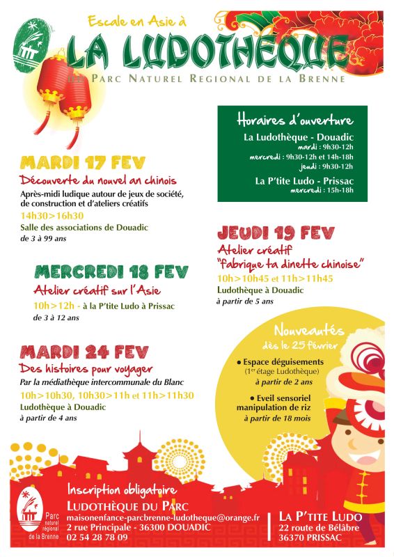 - Le mardi 17 février à 14:30 : Découverte du nouvel an chinois (dès 3 ans) à Salle des associations à Douadic