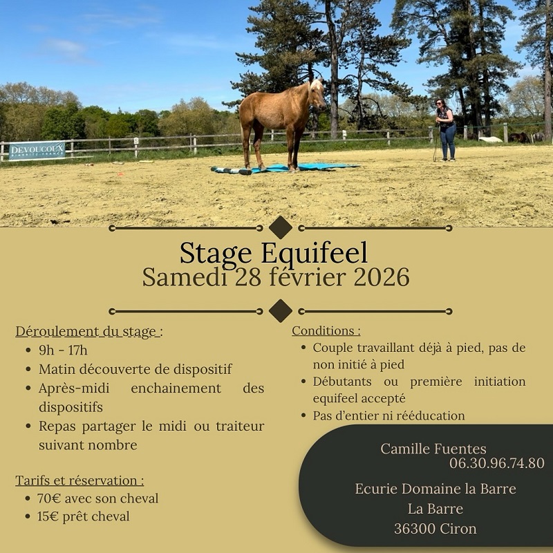 Stage avec une matinée découverte de dispositif et l'après-midi d'enchaînement des différents dispositifs. Ce stage s'adresse à des couples (cheval/cavalier) travaillant déjà à pied, Pas de non-initié à pied. Débutants et 1ère initiation équifeel accepté; Pas d'entier ni de rééducation.